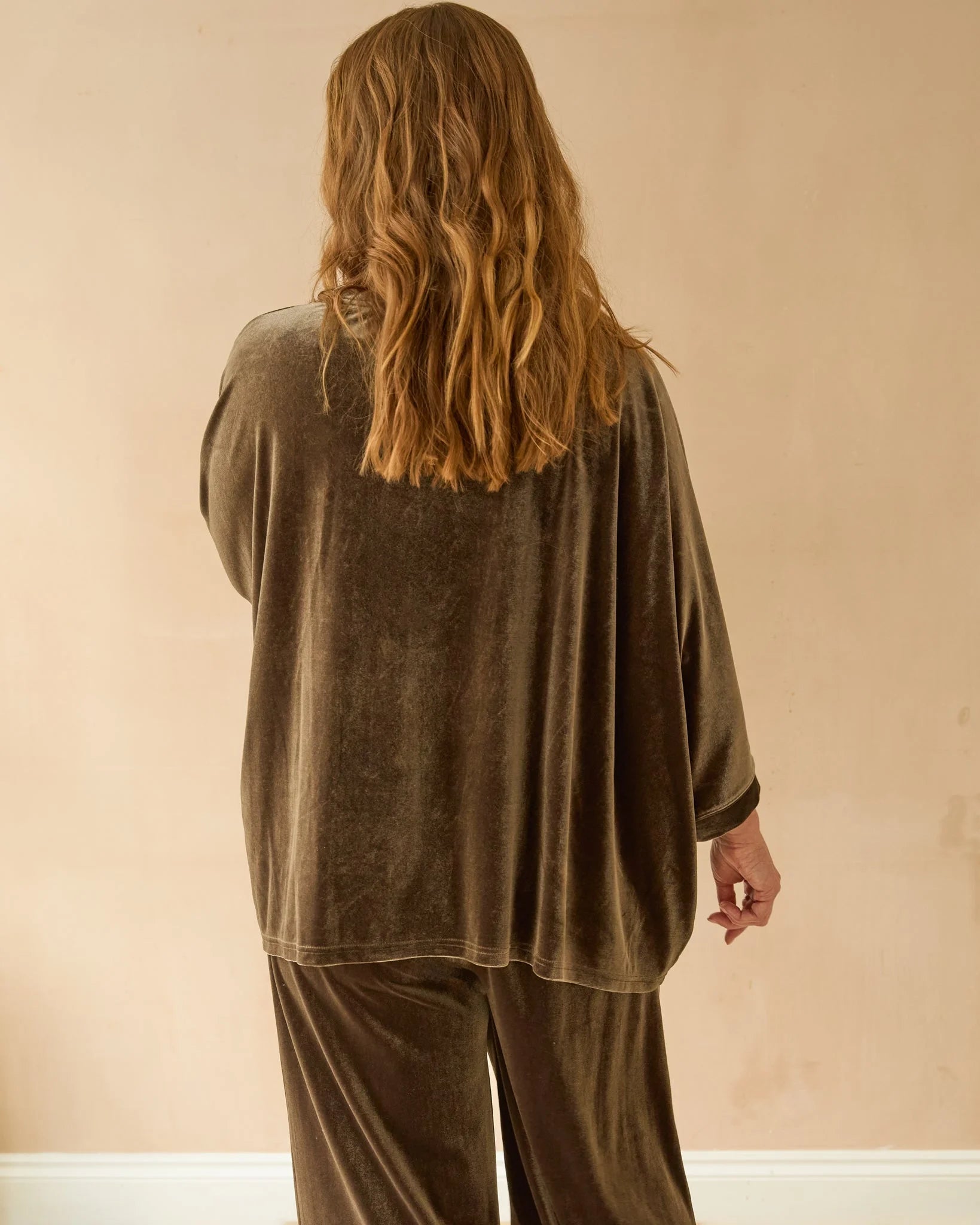 Erin is the ultimate floaty lounge top — soft, swingy, and effortlessly relaxed. Made from plush velour, it features a wide boxy cut, round neckline, and three-quarter length sleeves finished with a gentle cuff.