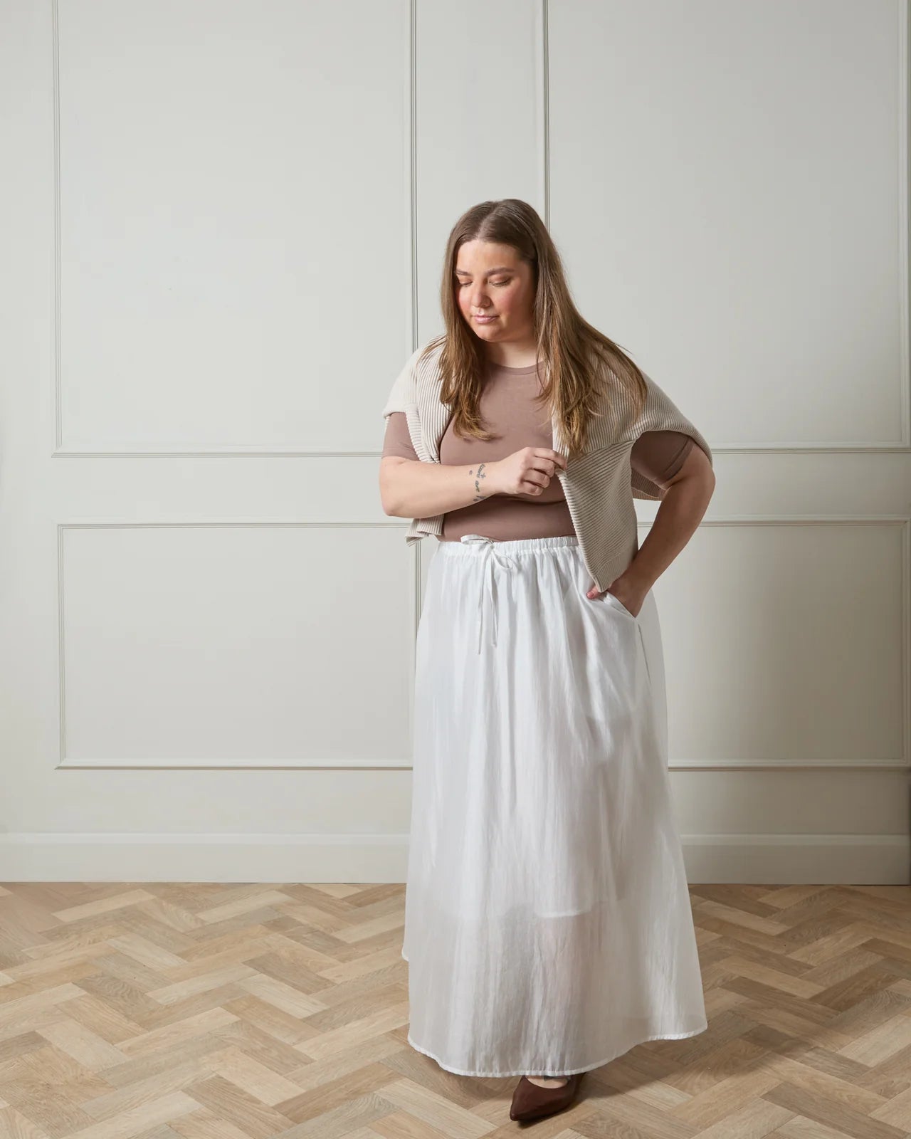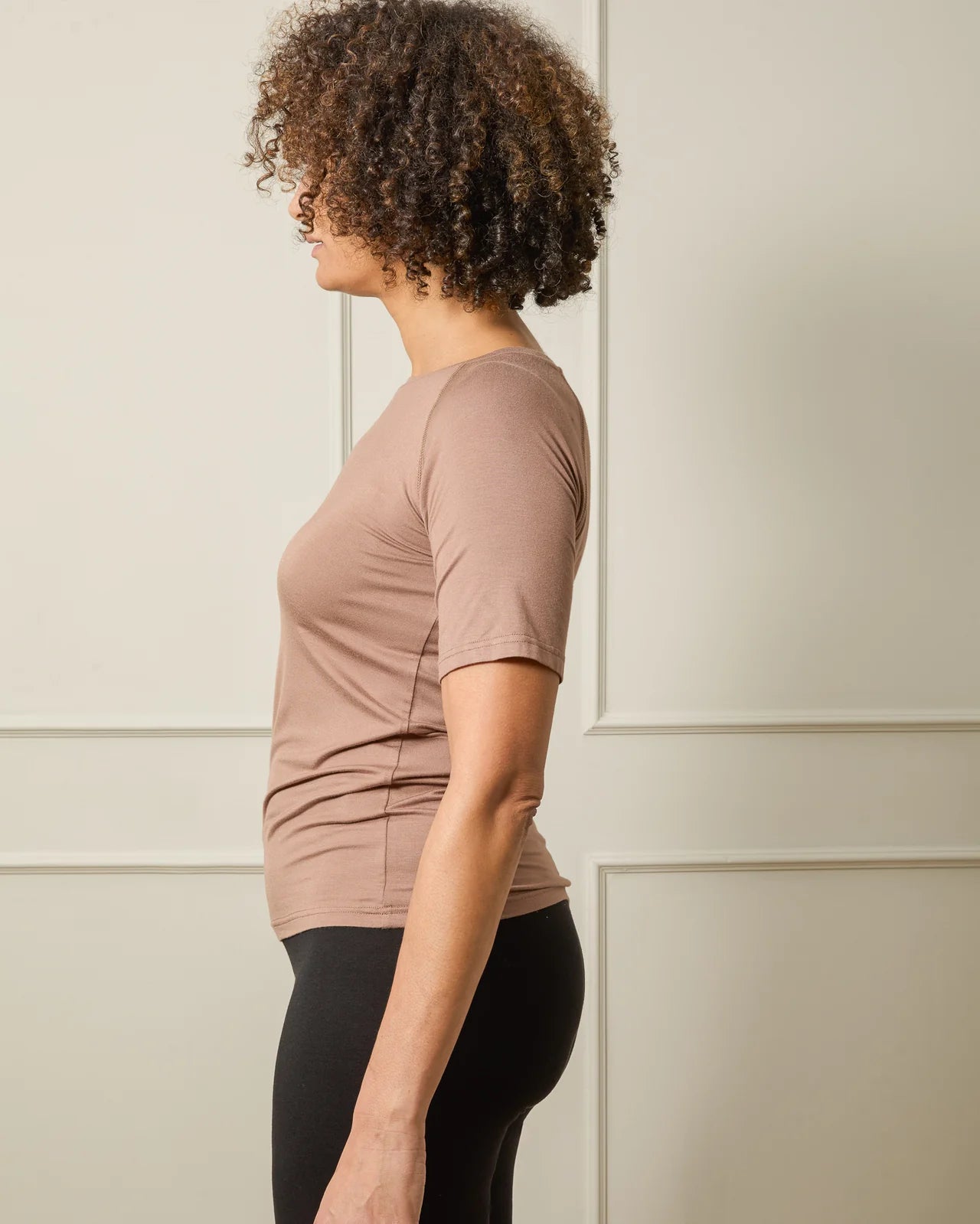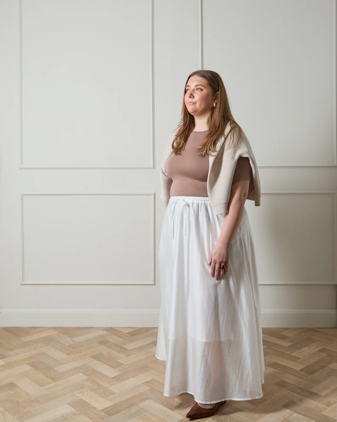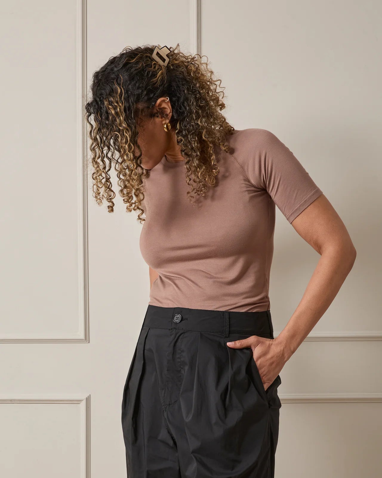 The Maddie top is the perfect everyday garment for layering or wearing on its own. Made from soft jersey fabric, it features a round neck and short sleeves, offering both comfort and simplicity.
