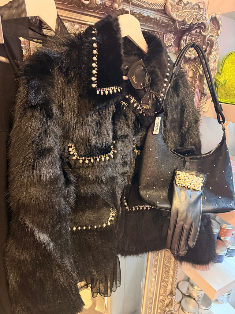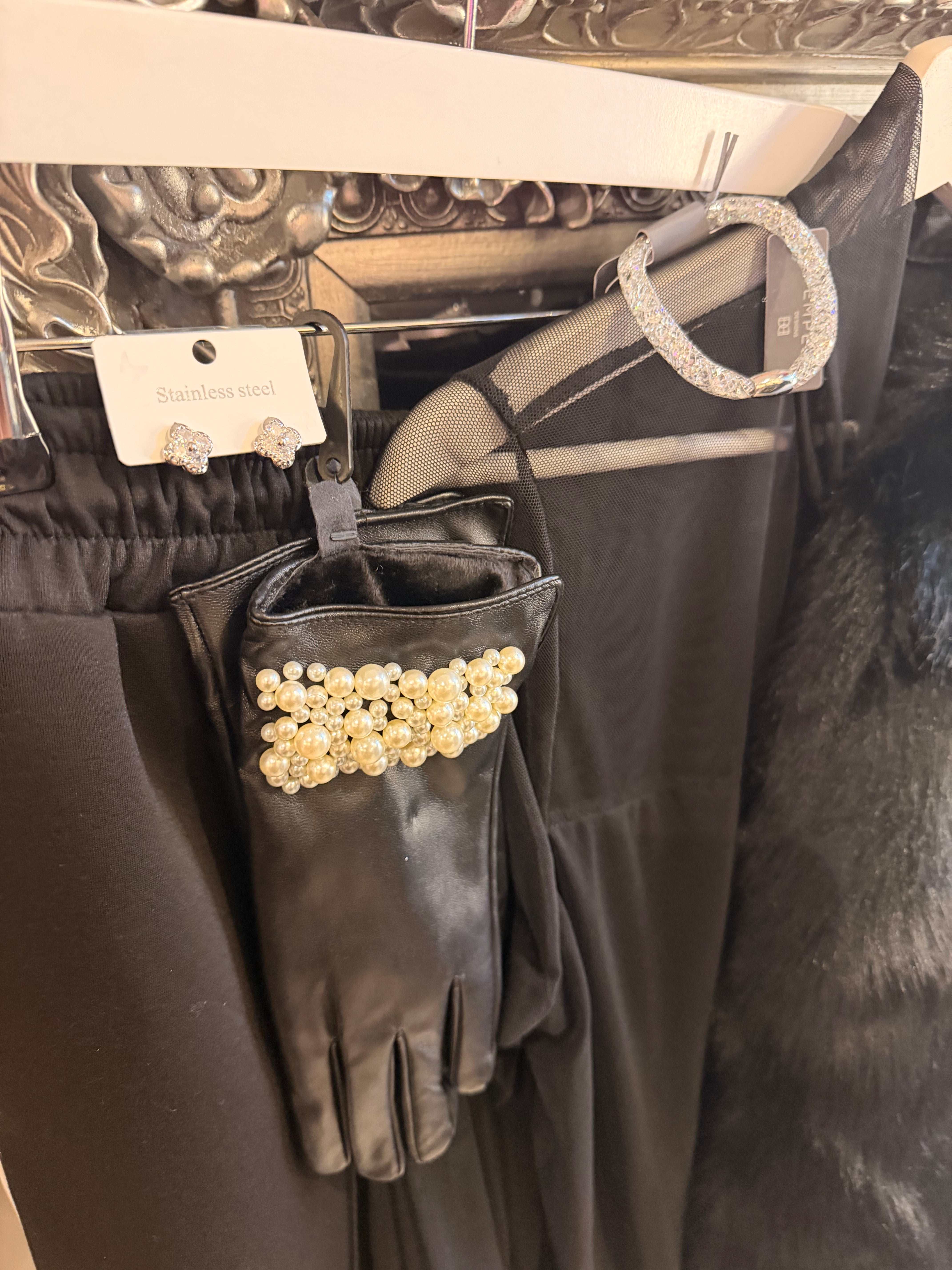 Black faux leather gloves with pearl details