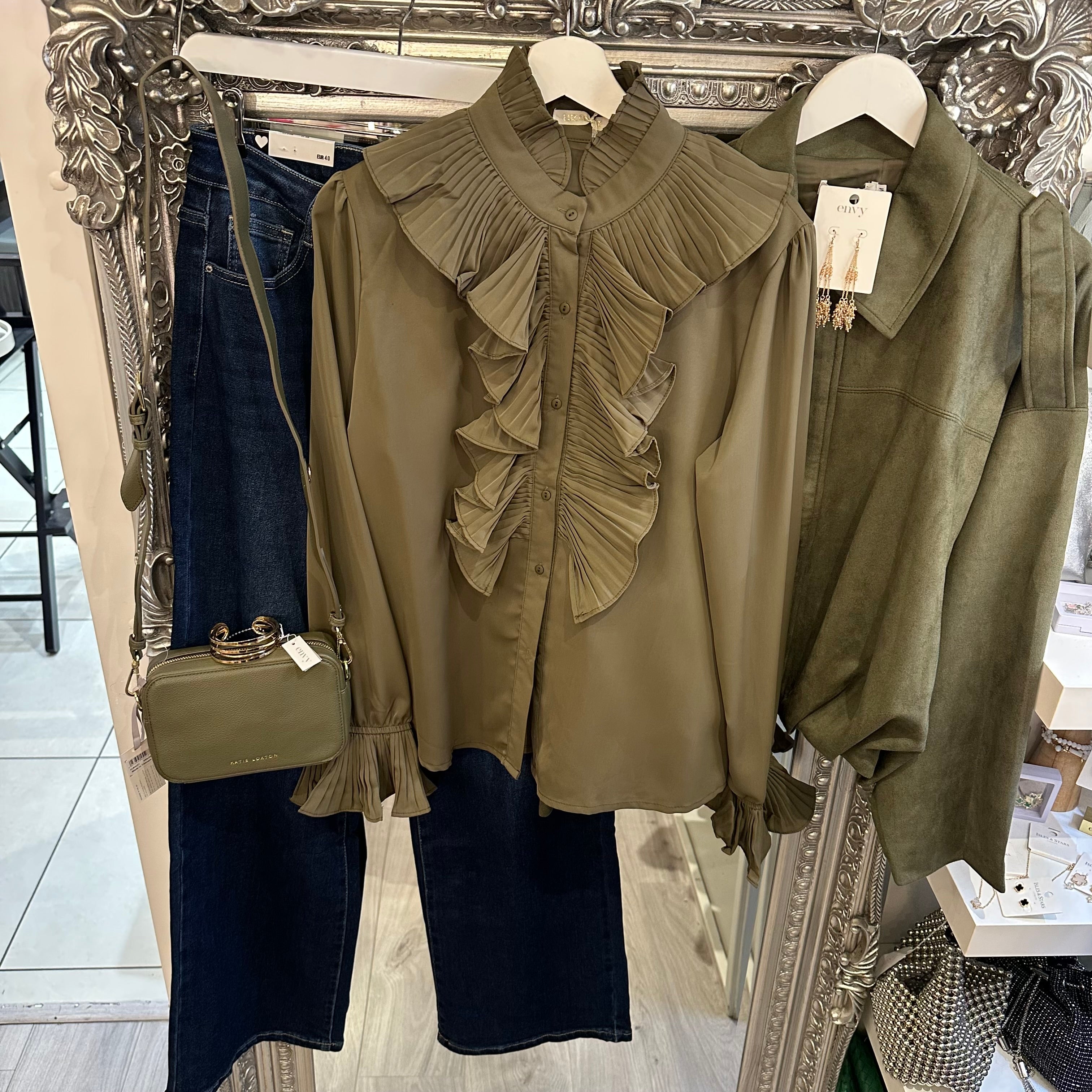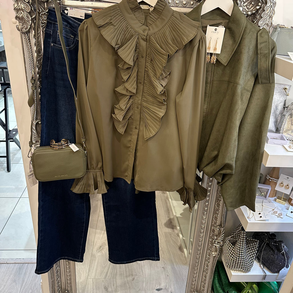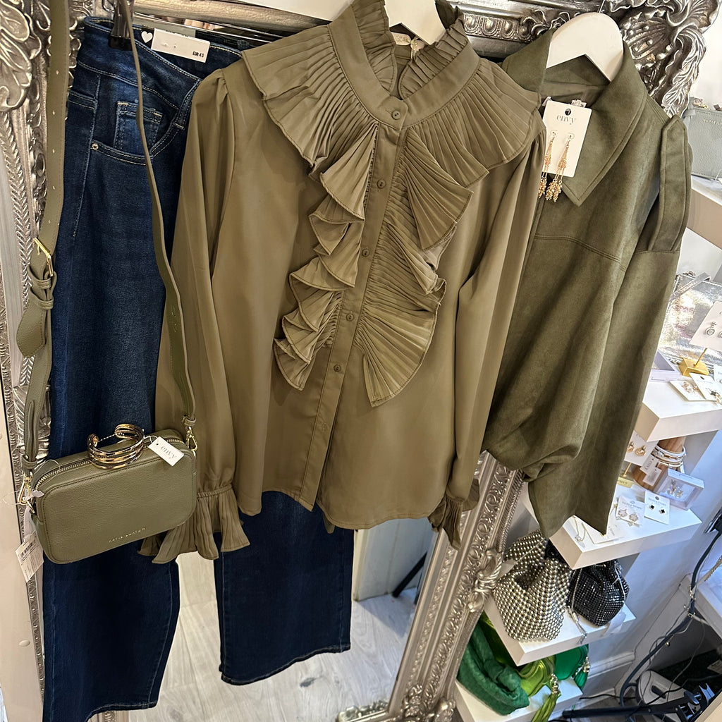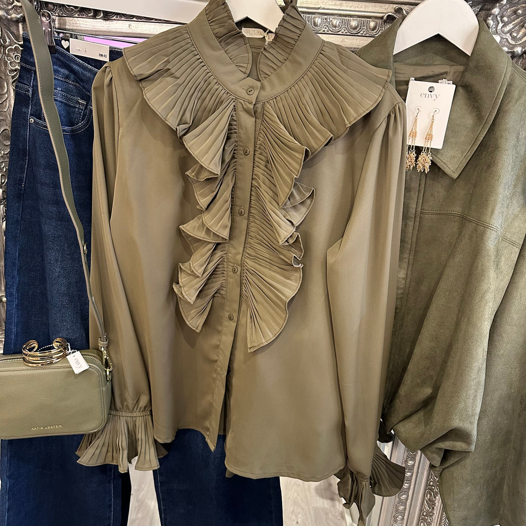 Khaki ruffle blouse