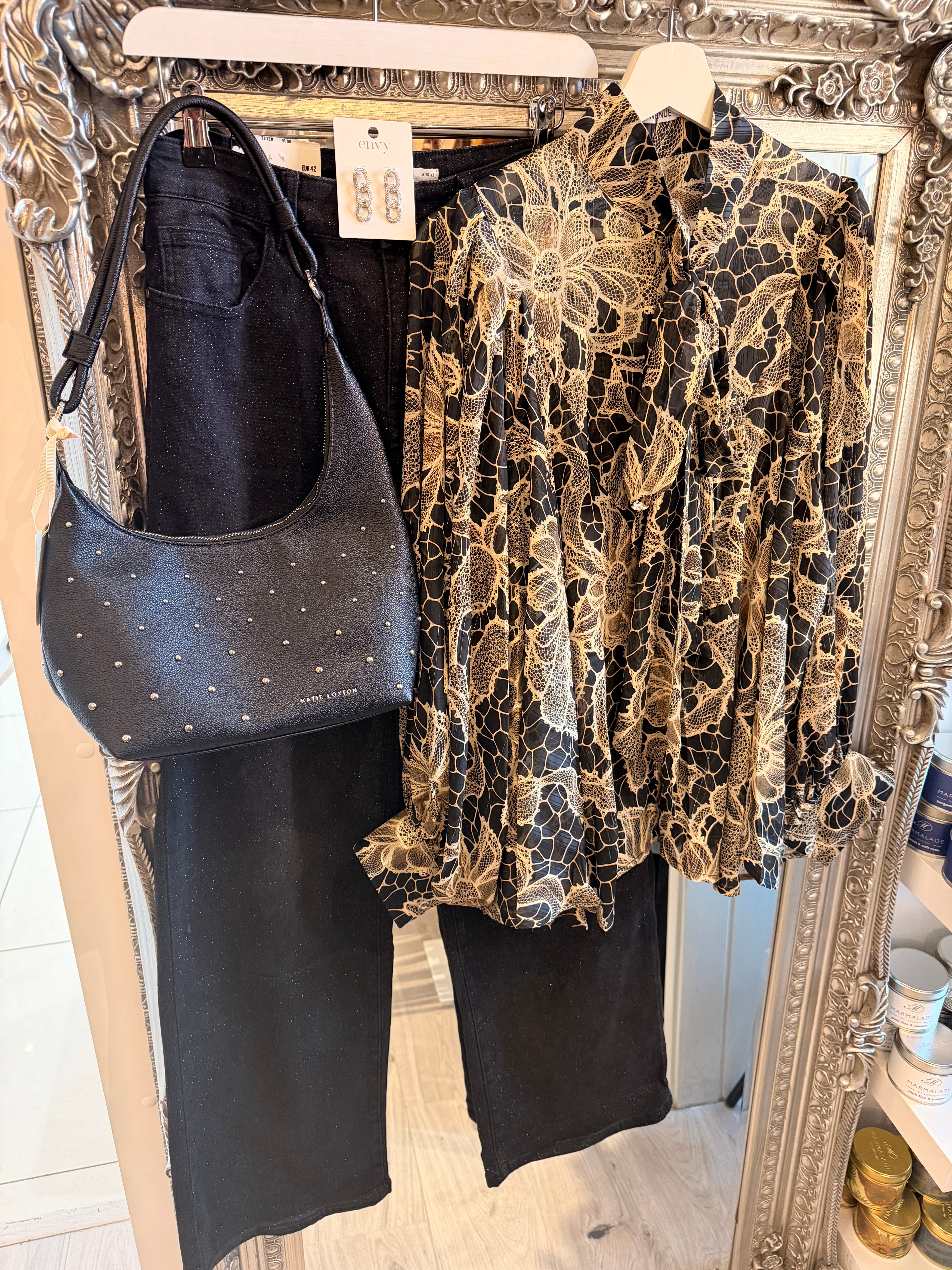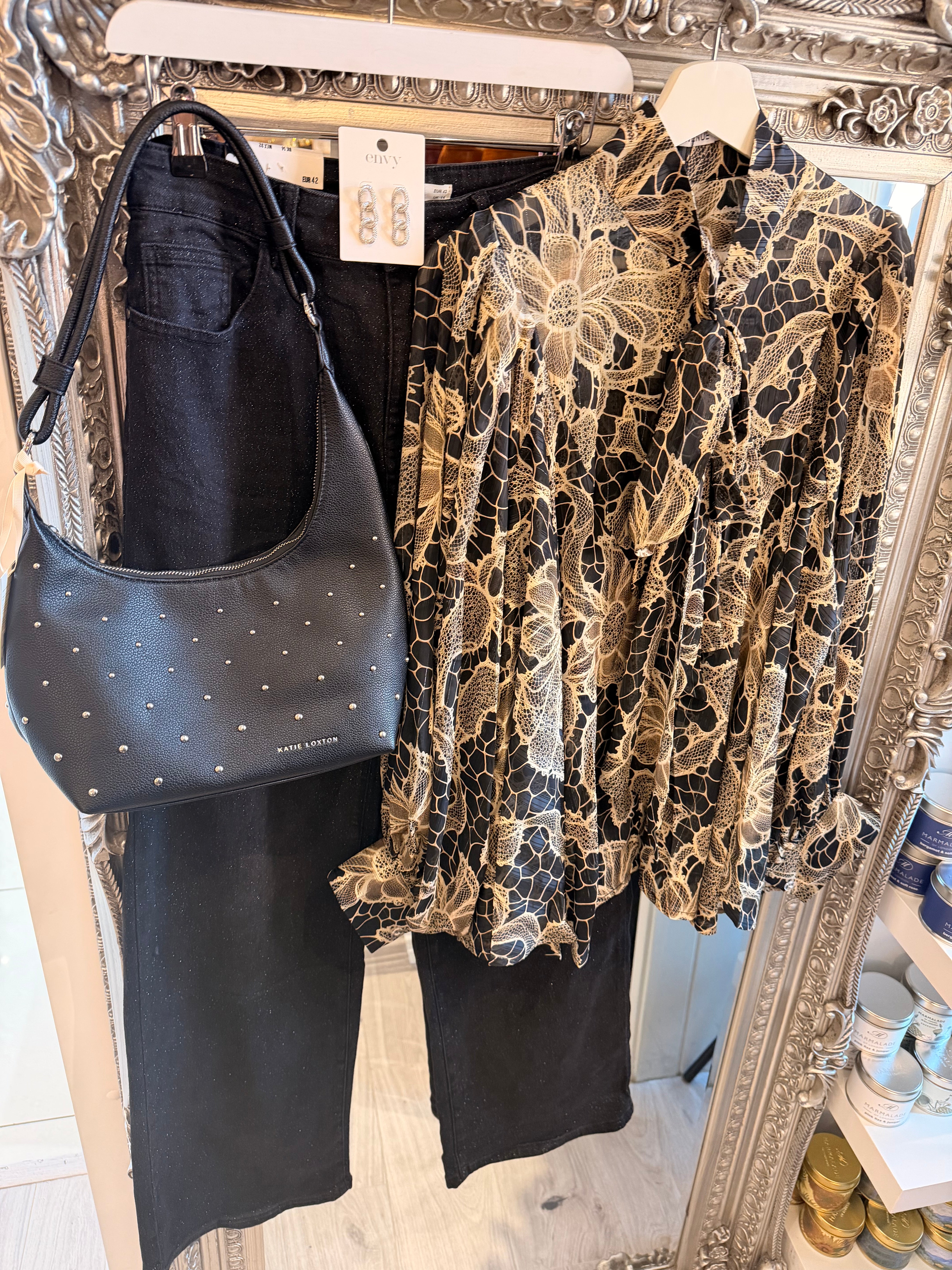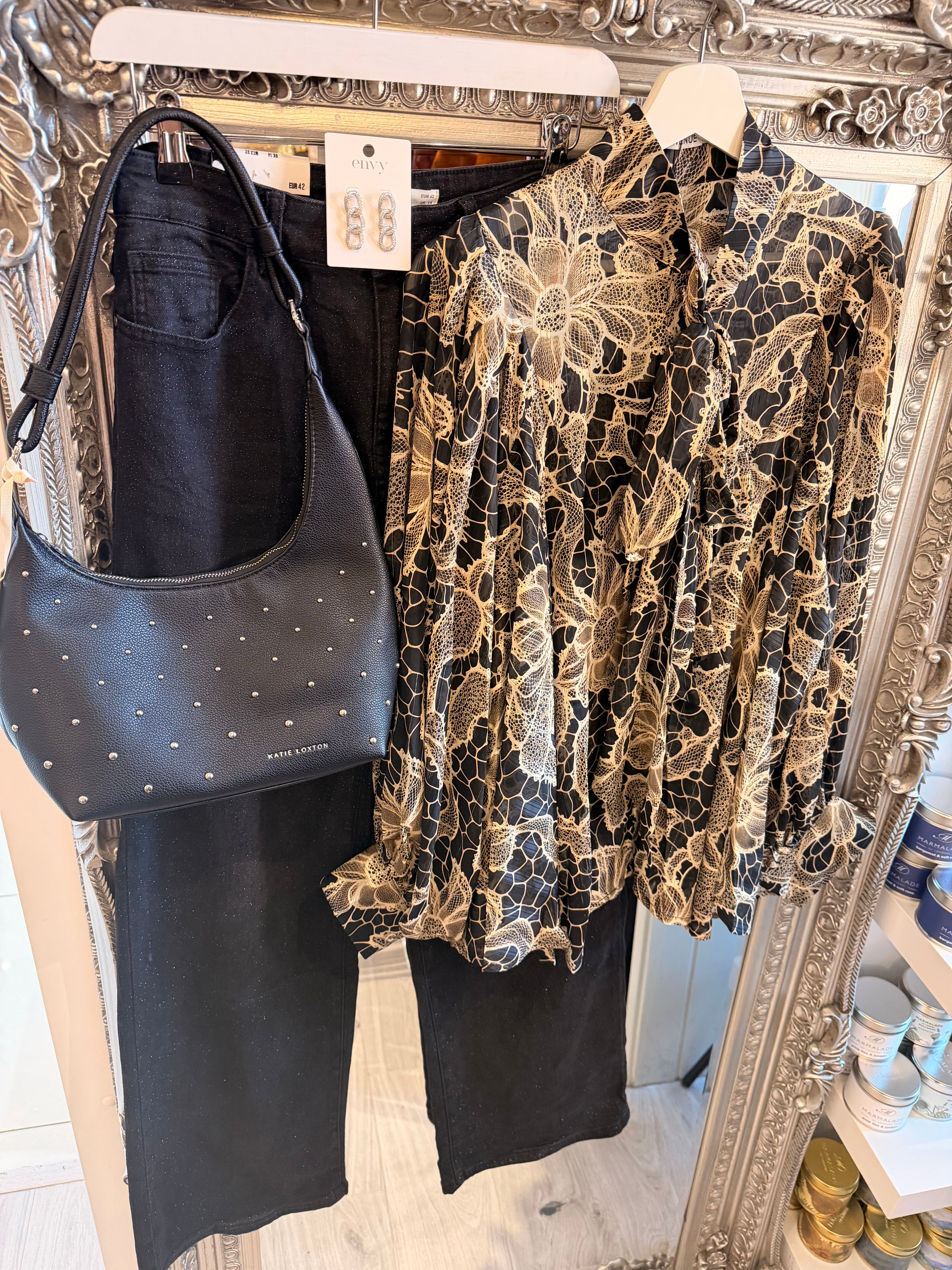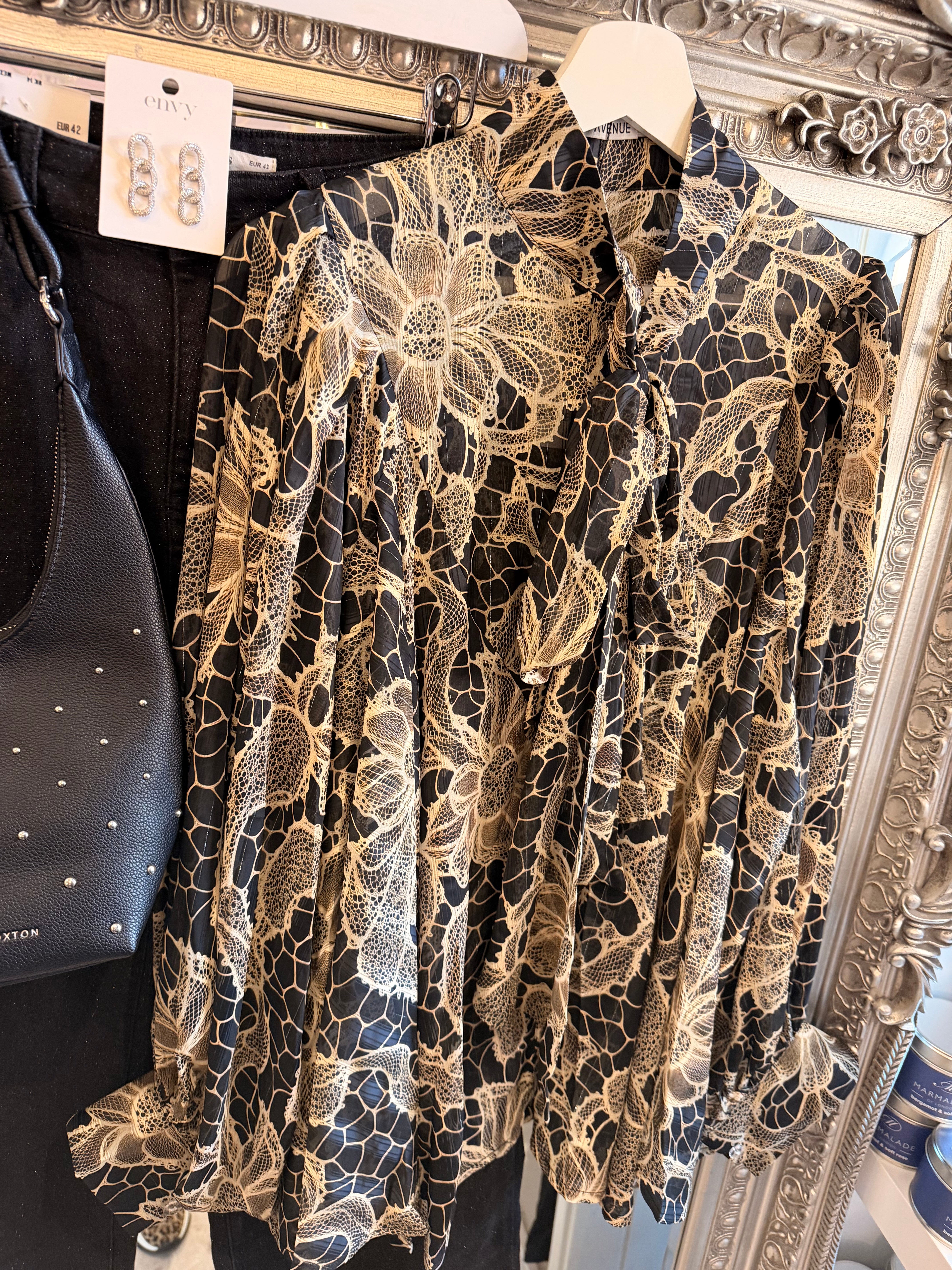 Pussybow blouse - lace look detail is backordered and will ship as soon as it is back in stock.