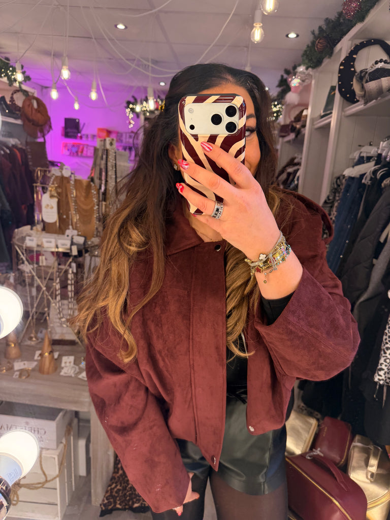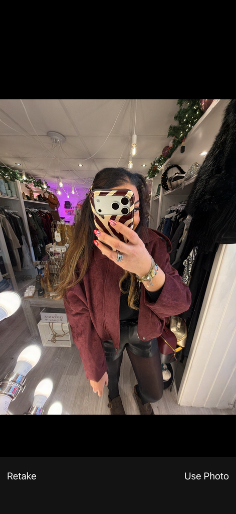 Wine oversized faux suede bomber jacket - M/l is backordered and will ship as soon as it is back in stock.