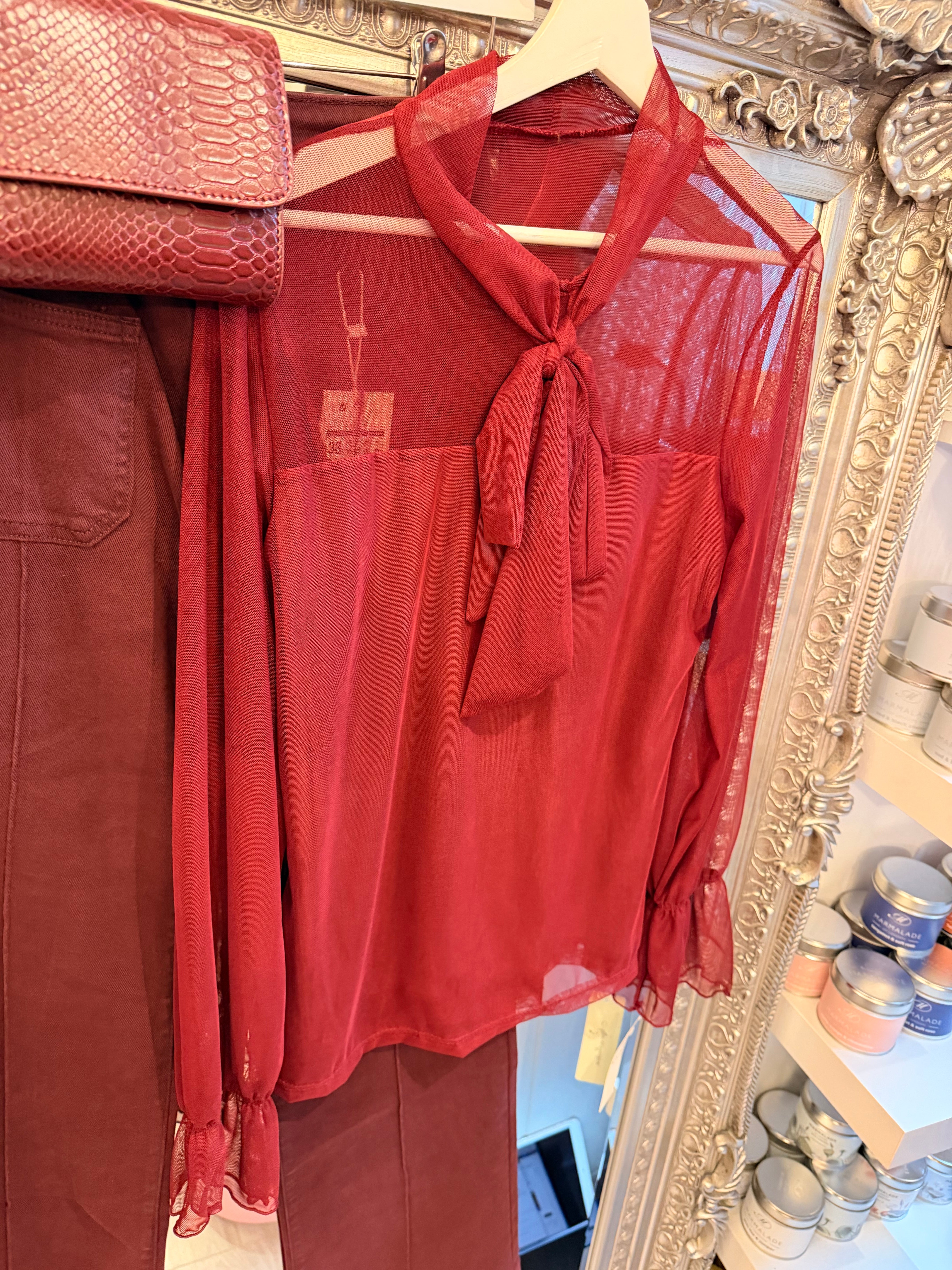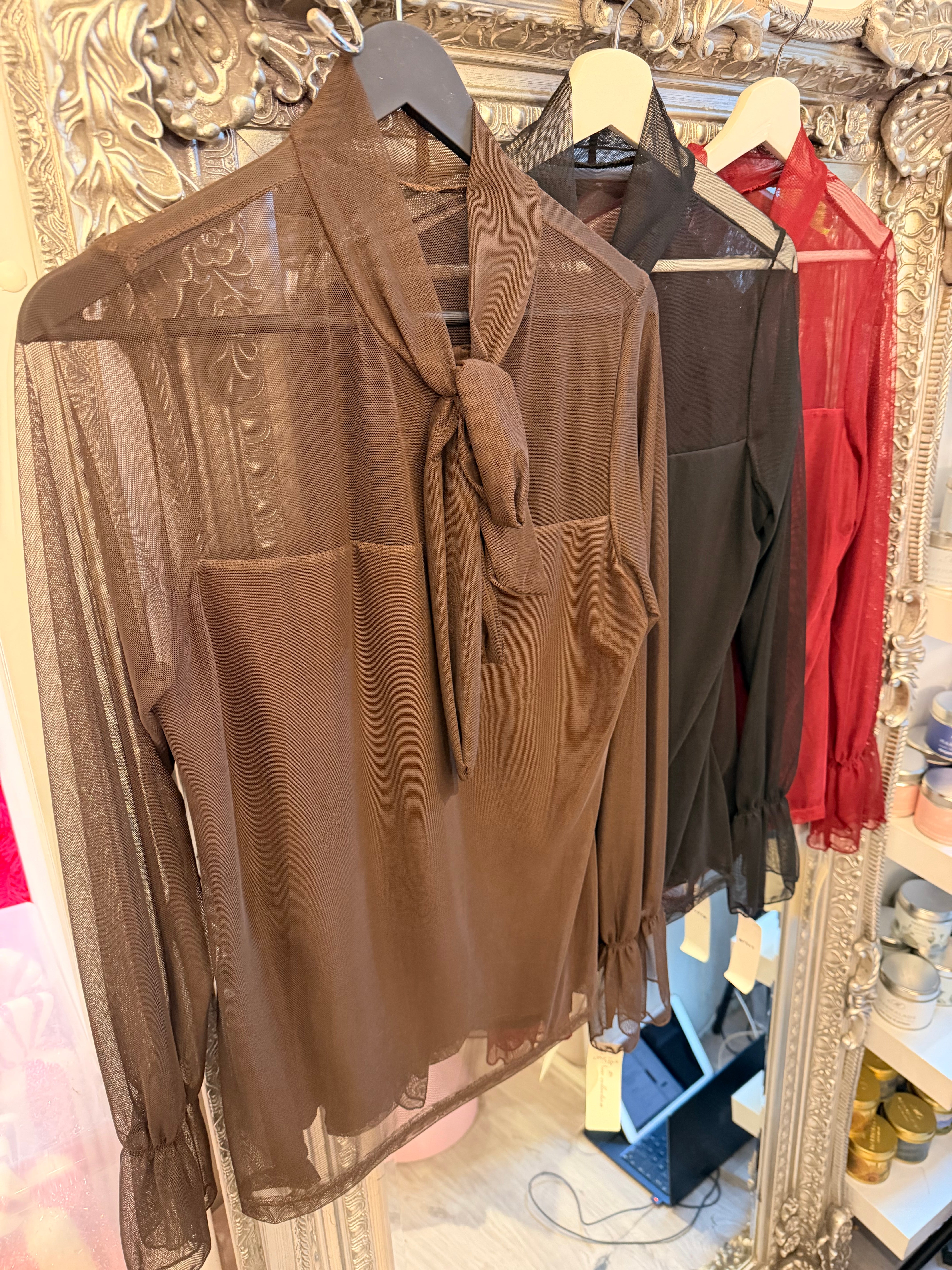 Bow mesh blouse - Brown is backordered and will ship as soon as it is back in stock.