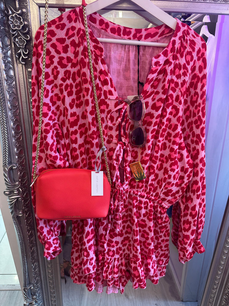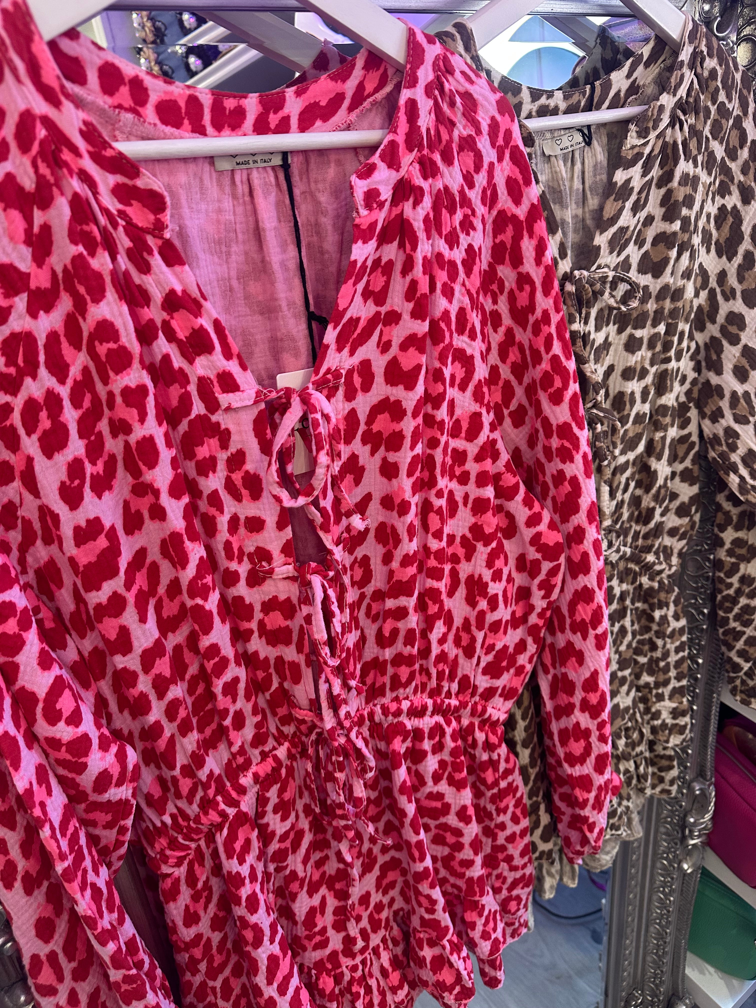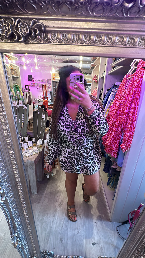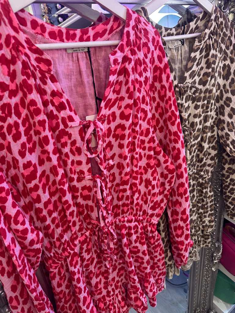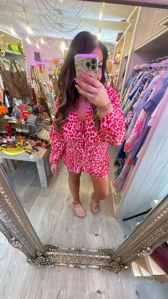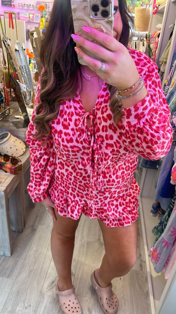 Leopard tie front playsuit - Brown is backordered and will ship as soon as it is back in stock.