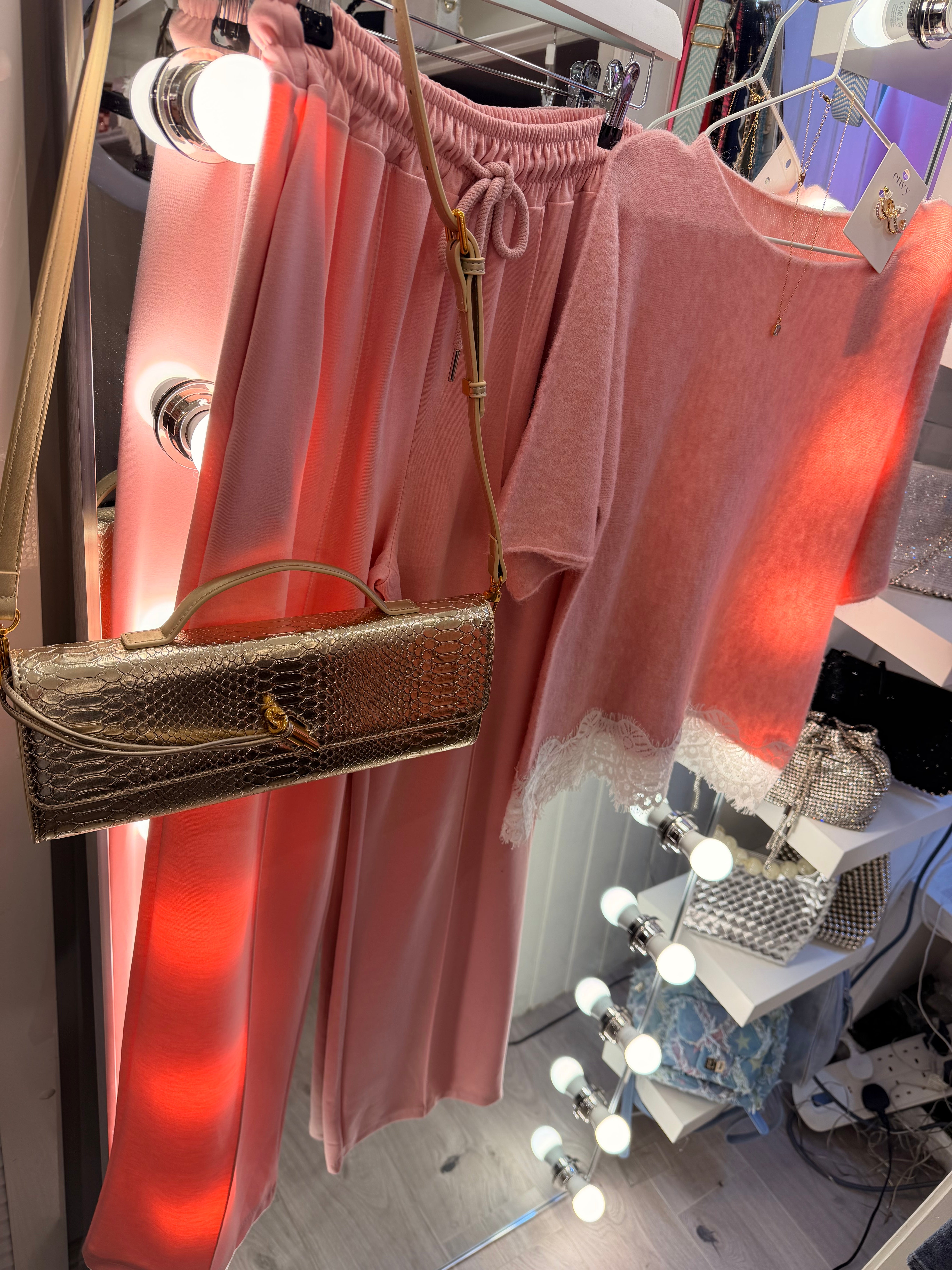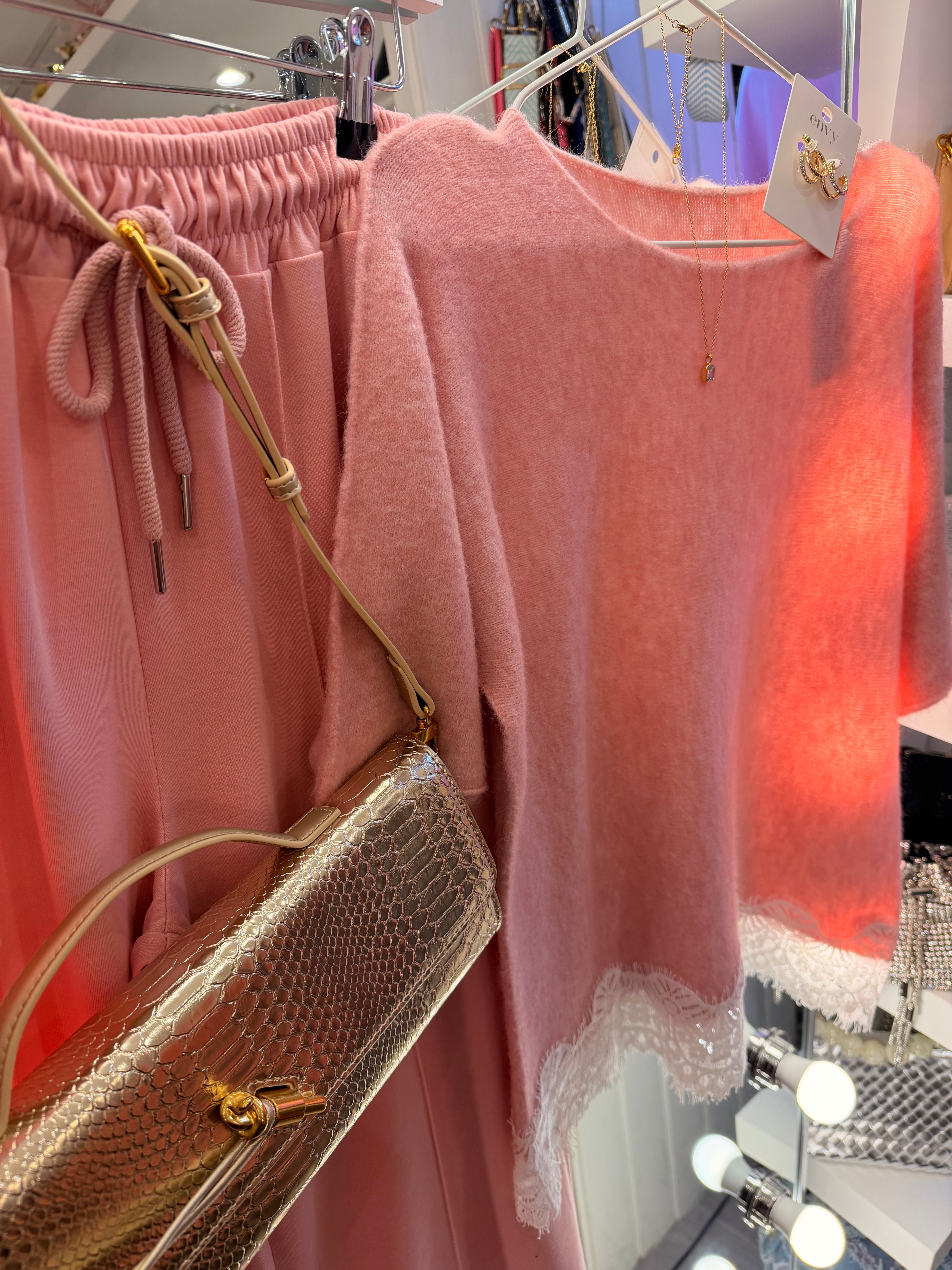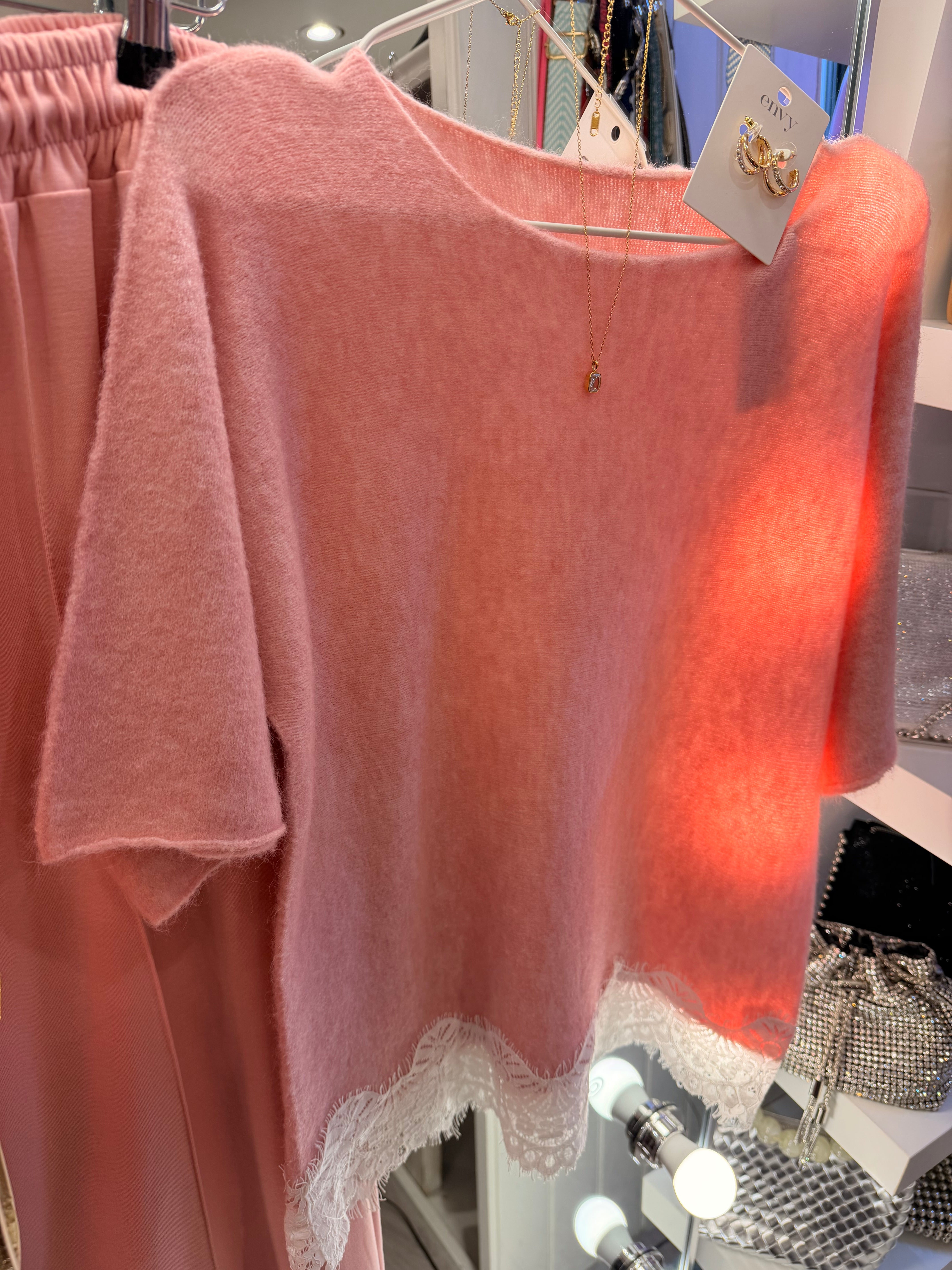 Pink lace detail soft knit jumper top is backordered and will ship as soon as it is back in stock.