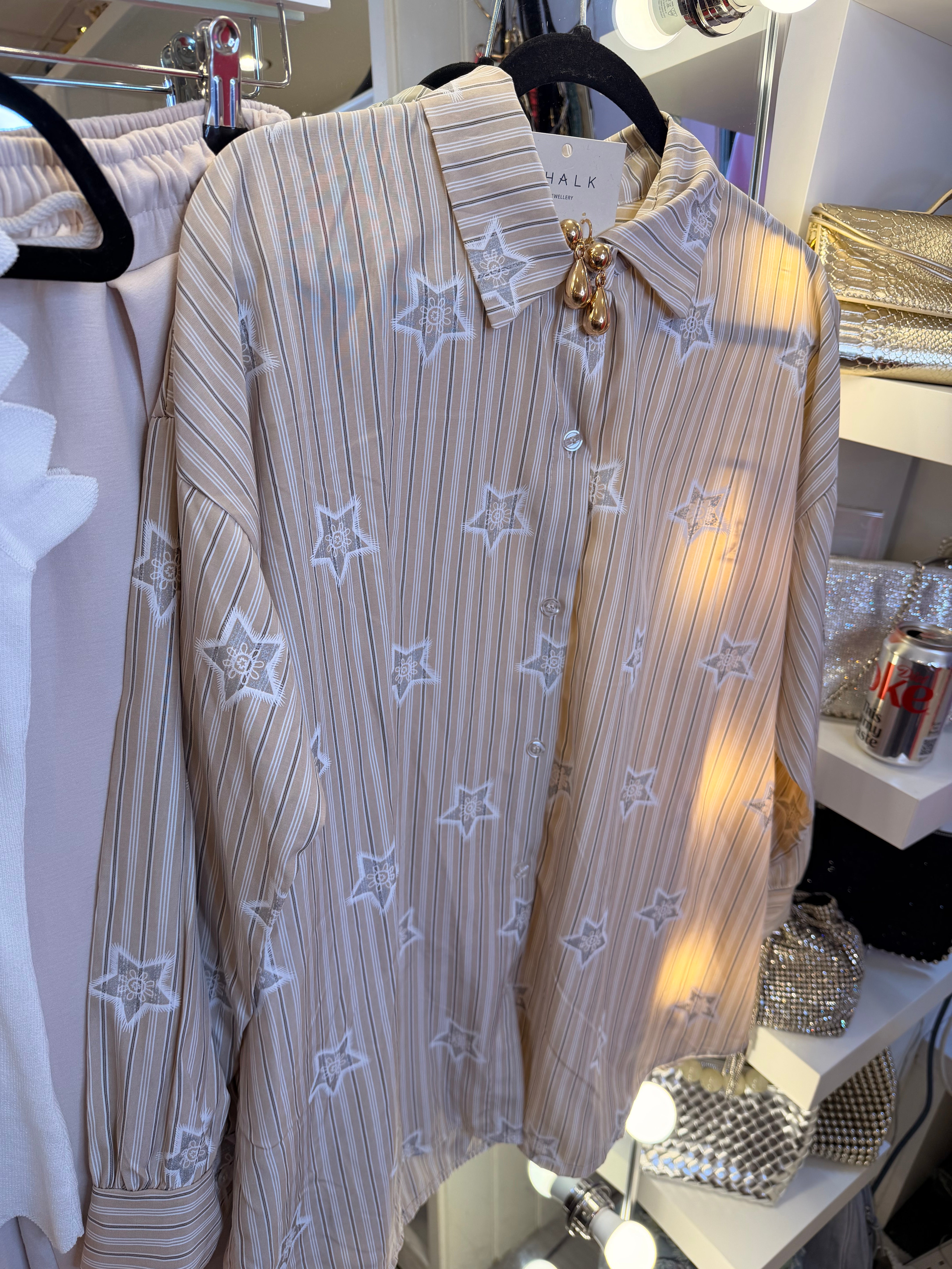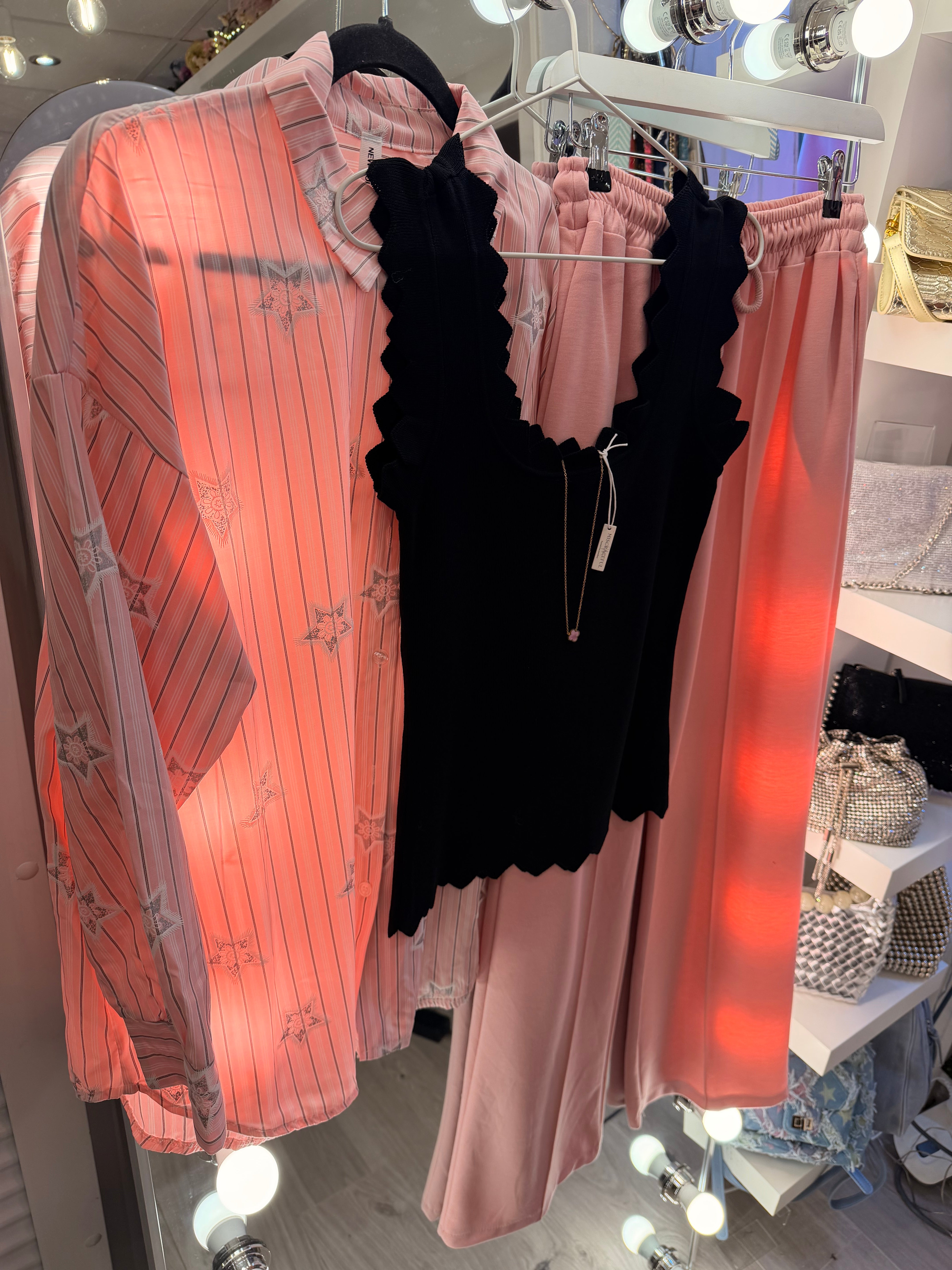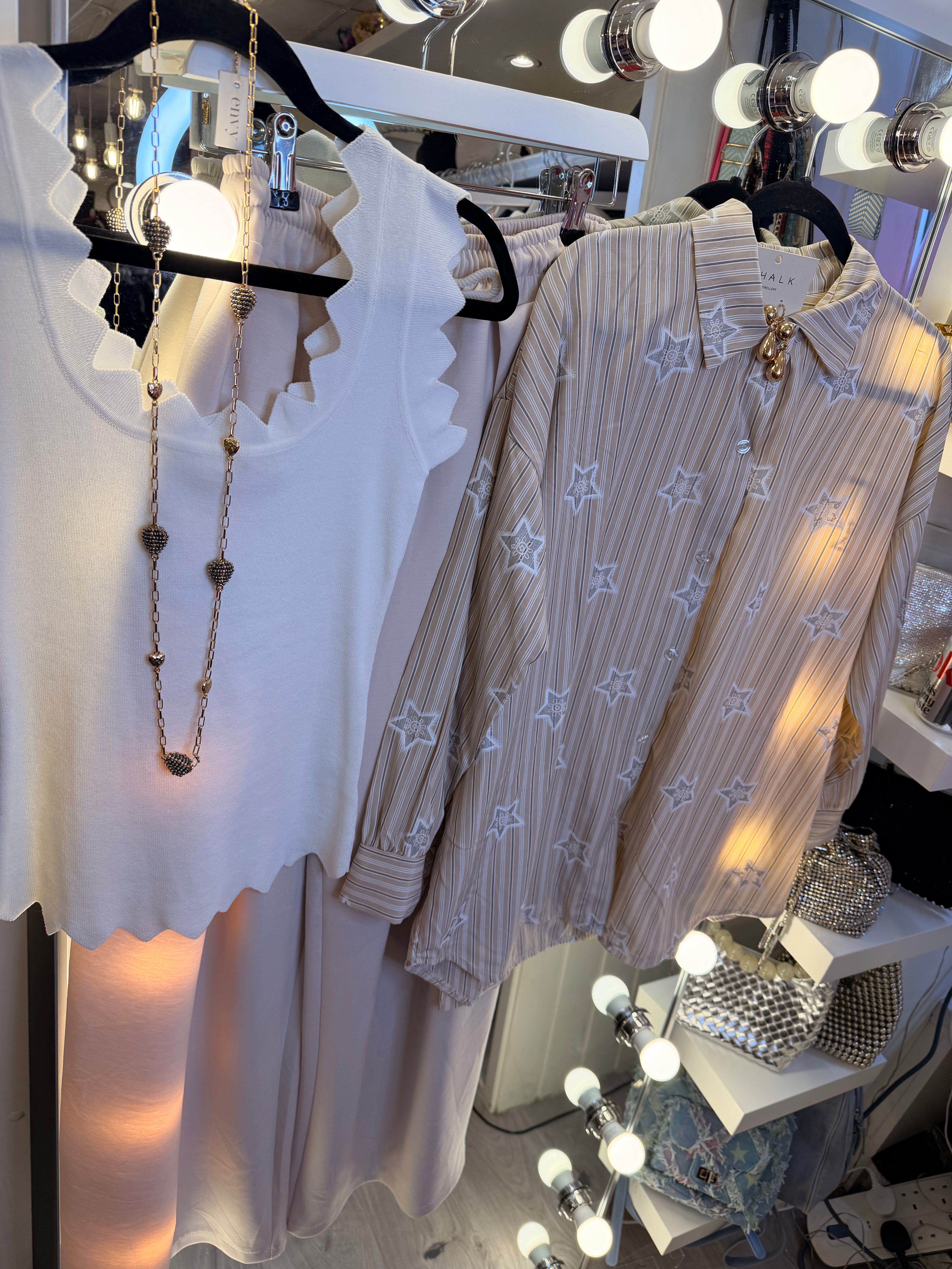 Perfect with jeans, joggers, over leggings. Either wear loose, tucked in or open over a soft knit scallop top.